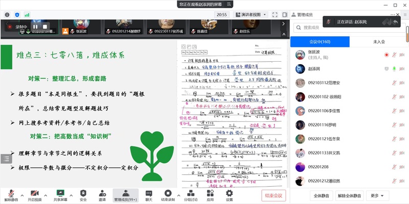 为更好营造年级优良学风,学院在新生中发起假期线上小组自习活动,利用寒假前网课阶段、开学前十天两个黄金时间段组织学生相约云端,相互监督,共同提升学习质量和效率。同时,定期邀请高年级优秀学长进行分享,如校长特别嘉奖提名奖获得者赵添润分享高数学习方法与心得、大二年级学导进行《高等数学》、《工程识图》学习提纲与重点题型梳理,并形成备考题库供同学们复习参考。