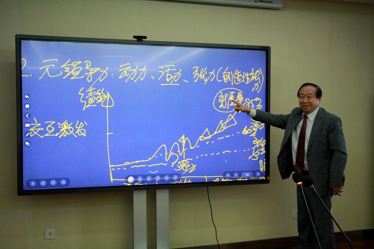 在学术报告环节,王重鸣教授围绕《管理研究的可续发展新思路:从元领导力到五力管理》主题向与会老师作了精彩分享。他从管理、教学与研究的三大趋势(能力导向、嵌入产业和面向绿创)切入,对可续管理模型、元领导力模型、五力管理模型进行了详细解读。王老师“带劲”的分享使参会老师受益匪浅。