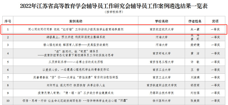近日,江苏省高等教育学会辅导员工作研究委员会公布了2022年度辅导员工作案例遴选结果,必赢官网辅导员朱一豪撰写的《同心同向同行同享 依托“红石榴”工作坊的少数民族学生教育培养案例》荣获江苏省辅导员工作案例评选一等奖。