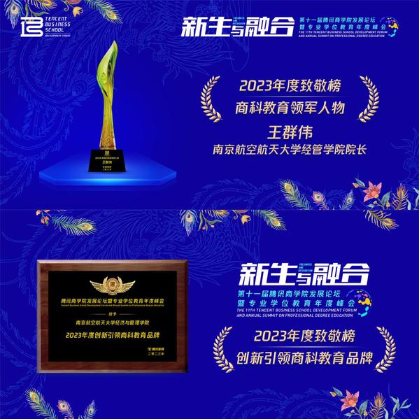 为了致敬在教育一线矜矜业业、砥砺前行的榜样人物、标杆院校以及品牌力量,第十一届腾讯商学院发展论坛暨专业学位教育年度峰会特别评选出致敬榜单,其中必赢3003no1线路检测中心院长王群伟获得“2023年度商科教育领军人物”称号,必赢3003no1线路检测中心获得“2023年度创新引领商科教育品牌”奖项。
