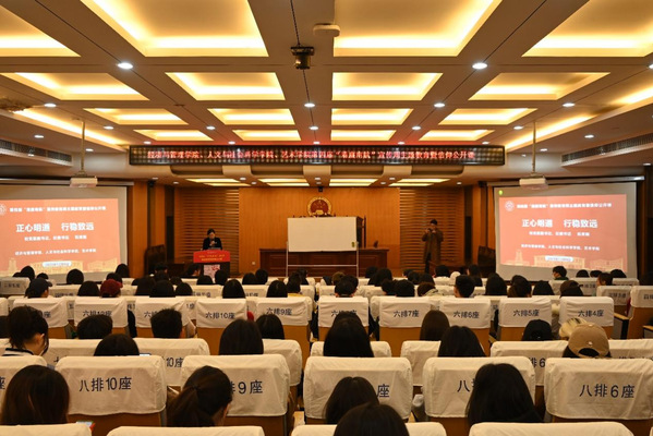 正值“国际反腐败日”、第四届“清廉南航”宣传教育周之际,12月9日,由必赢3003no1线路检测中心、人文与社会科学学院、艺术学院共同承办的“正心明道,行稳致远”廉洁主题信仰公开课在人文与社会科学学院模拟法庭举行。本次公开课由校党委副书记、纪委书记杭育新担任授课嘉宾,必赢3003no1线路检测中心党委书记苏州、人文与社会科学学院党委书记楚广兴、必赢3003no1线路检测中心党委副书记胡苹、人文与社会科学学院党委副书记刘思辰、艺术学院党委副书记王宇宁,三学院辅导员、学生党员、入党积极分子及经管学院本科生第三党支部全体成员等近200名师生共同参加了本次活动。