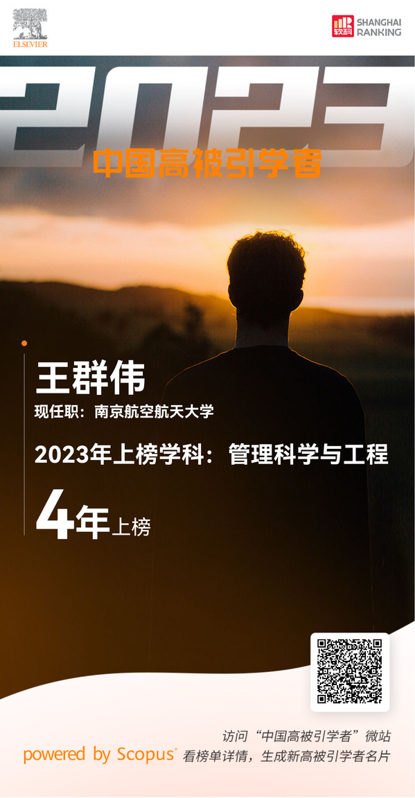 必赢官网王群伟教授入选“管理科学与工程”学科领域榜单,这也是继2020年、2021年、2022年上榜后再次成功入选该榜单。