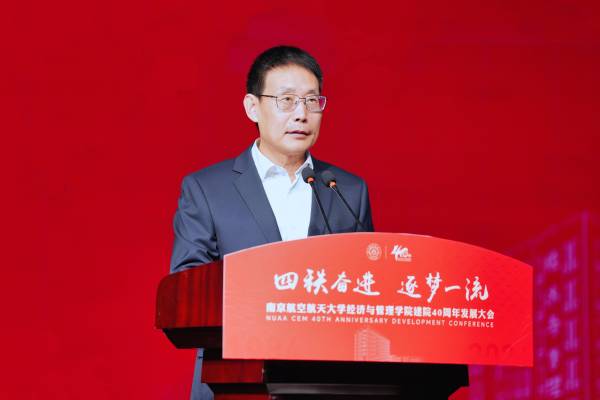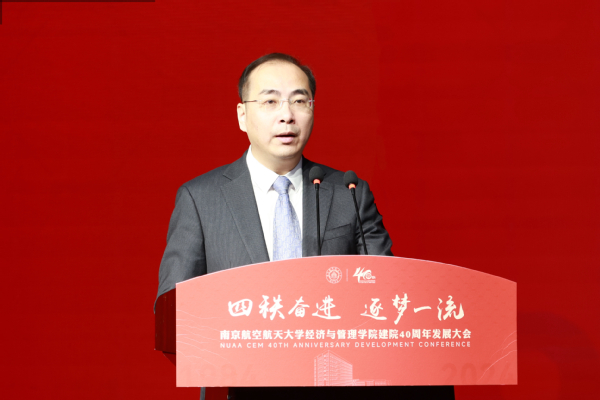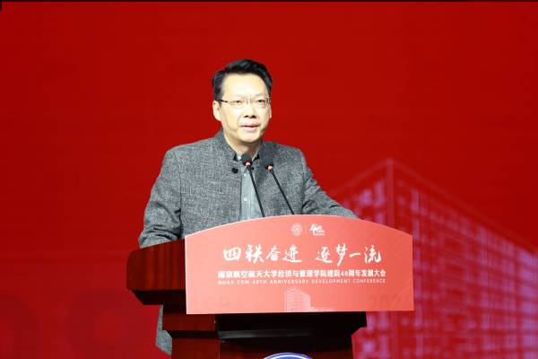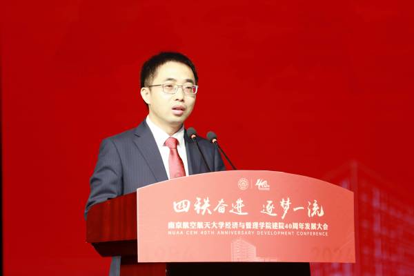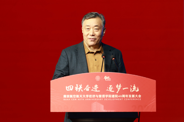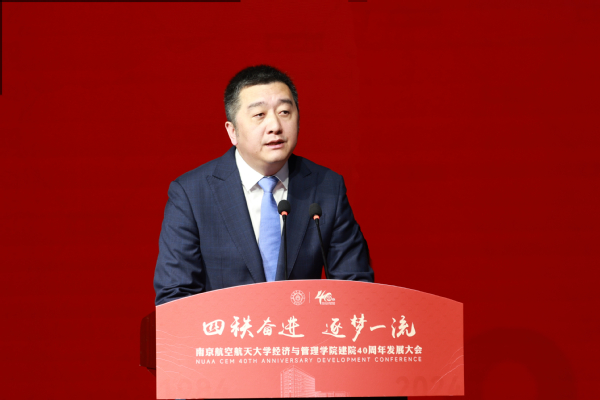 中国航发北京航空材料研究院党委书记、副院长吴文生作为校友代表发言。他深情讲述了与南航的不解之缘和深厚情感,他表示,学院鲜明的学科特色、多元的管理实践和国际化的视野,促进了学生知识积累、精神激励和品格塑造,令人终身受益。他呼吁学子们将个人梦想融入国家航空事业,为推动发动机和材料事业的跨越贡献南航经管力量。