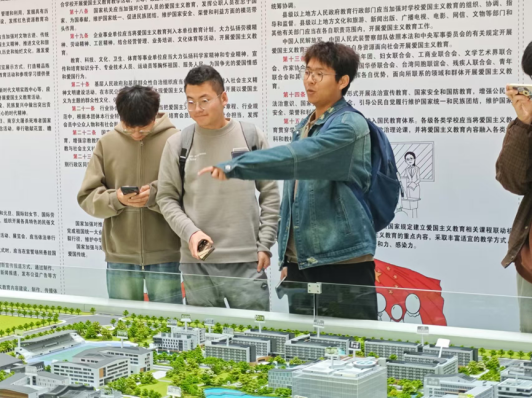 接着同学们共同“俯瞰”了必赢3003no1线路检测中心天目湖校区。参观活动现场放置了校区微观模型,同学们兴致勃勃地向同伴们分享校区建筑背后所蕴含的“红色基因”与“蓝色梦想”。从“巡天遥看一千河”的巡天楼所体现的为国家航空航天事业发展不懈奋斗的报国热情,到“志在长空牧群星”的牧星楼所彰显的南航学子胸怀天下壮志昂扬的爱国热血,同学们在交流和互动中加深了对校区建设与发展的了解与体悟。