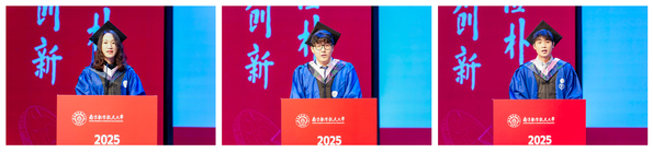 奋楫扬帆,续写华章。2025届毕业生代表丁毓敏、王一鸣和刘克,先后上台发言,回望在南航流光淬炼的求学岁月,感恩母校赋予的翱翔之力。