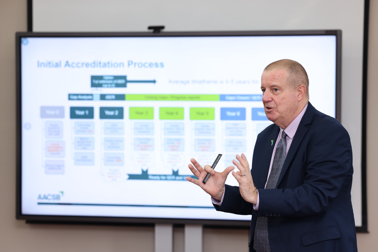 Geoff Perry对于学院学科实力与特色、认证专班团队的工作、初步形成的EA报告(Eligibility Application,资格认证申请)等给予了高度评价,在介绍AACSB愿景、价值理念、全球影响力、会员院校规模以及认证流程基础上,重点针对学院下一阶段iSER报告(Initial Self-Evaluation Report,初始自评估报告)的九大标准进行了详细解读,并从战略规划落地、师资队伍建设、学生培养成效等多维度提出针对性建议。他指出,AACSB国际认证可以助力学院构建完善一整套与学院使命和目标相一致、内部驱动的持续质量改进框架体系。