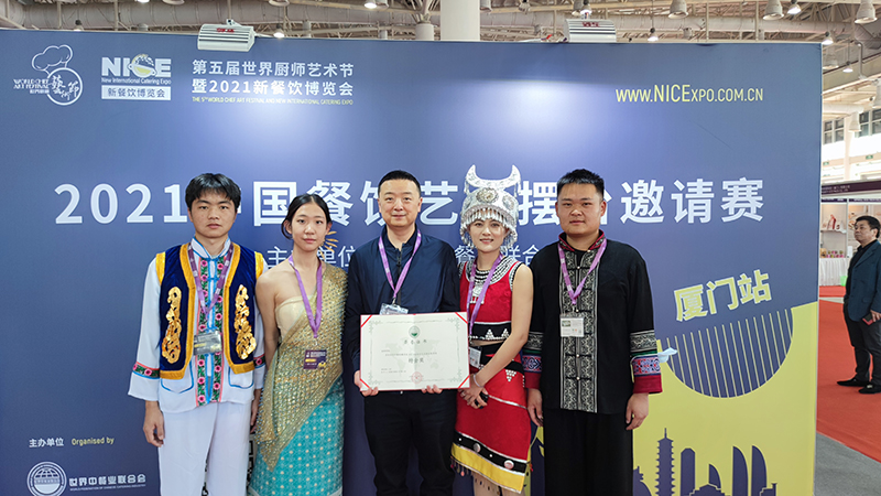 近日,“第五届世界厨师艺术节暨2021新餐饮博览会”在厦门举办,本次活动通过会议论坛、烹饪大赛、展览展示和商务考察这四大板块,搭建对话平台,链接行业资源,促进中餐产业经济发展,共同见证中国餐饮行业的发展创新与合作共赢。best365足球官网旅游学院作品《滇之韵》在活动烹饪大赛“2021中国餐饮艺术摆台邀请赛”中,以第一名成绩荣获特金奖。