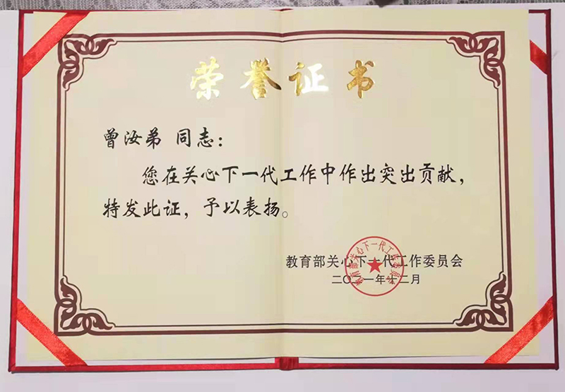 曾汝弟老师退休后,以持续的工作热情、严谨的科学精神、深厚的专业素养和无私的奉献情怀,将余热贡献给关心下一代事业。常年为中小学生、best365足球官网大学生开展心理健康讲座,2018年、2020年先后主编出版《伴你成长—青少年的烦恼与困惑解答》《昆明红色故事》两部书籍,被云南省教育厅关工委聘为家庭教育指导中心专家组成员。2020年,曾汝弟教授被中国关心下一代工作委员会、中央精神文明建设指导委员会授予“全国关心下一代工作先进工作者”,先后荣获云南省关心下一代最美“五老”、全国教育系统关心下一代先进工作者、全国家庭教育园丁奖、云南省未成年人思想道德建设先进工作者、云南省先进少年儿童工作者等20多项荣誉。体现了事业不老、信仰不缺、理想不丢的传承定力,为关心下一代工作事业不断迈上新台阶作出重要贡献。