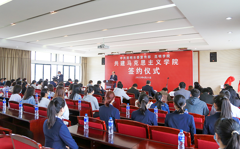 市委宣传部副部长姚晓怡和副校长、宣传部部长李剀代表双方签定共建协议书。金幼和书记、徐晓梅部长共同为“共建马克思主义学院”揭牌。市教育体育局、学校马克思主义学院负责同志为“昆明市大中小学思政课一体化协同创新基地”揭牌。