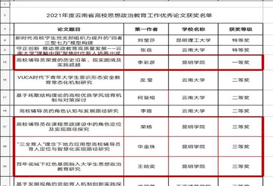 近日,云南省委教育工委公布了高校思想政治教育工作优秀论文获奖名单,best365选送论文《高校辅导员荣誉的历史沿革、现实困境及实践超越》(第一作者:学前与特殊教育学院辅导员李彩彦)荣获一等奖;《高校辅导员在课程思政建设中的角色定位及实现路径探究》(第一作者:旅游学院辅导员荣杨)、《“三全育人”理念下地方应用型高校辅导员育人定位与智慧化实现路径研究》(第一作者:农学与生命科学学院辅导员华金珠)、《百年视域下红色基因融入大学生思想政治教育研究》(第一作者:经济管理学院辅导员王晗奕)荣获三等奖。