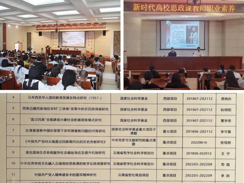 学院按照“学科交融、专业交叉、特色突出、争创一流”的专业建设思路,积极更新专业建设理念,强化专业内涵建设,增强专业特色优势。2021年获批云南省马克思主义理论一级学科硕士点立项建设;思想政治教育专业2021年获批国家“双万”计划云南省一流本科专业建设点,专业综合评价为C+。加大课程改革力度,努力打造一流本科课程,2021年《读懂云南:铸牢中华民族共同体意识的高校思政课育人模式创新与实践》获批云南省高等教育教学成果培育项目立项,20221门课程获云南省研究生优质课程立项、3门课程获校级一流课程立项、2门课程获校级课程思政项目立项。3门本科生思政课程获校级一流课程建设立项,1门研究生思政课程获省级优质课程建设立项、1门获校级优质课程建设立项,获省级特色研究生教学案例库项目立项1个。教师科研成果丰硕,出版学术专著22部,在CSSCI等学术期刊发表论文220篇;主持国家社科基金10项,省哲社课题22项,获省哲社优秀成果奖5项;各级各类科研经费582.25万元,承担省、市、县()政府部门和相关企事业单位课题26项,研究成果被省市政府采纳12项,成果社会转化效益突出。