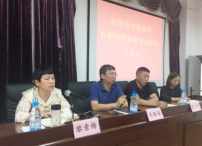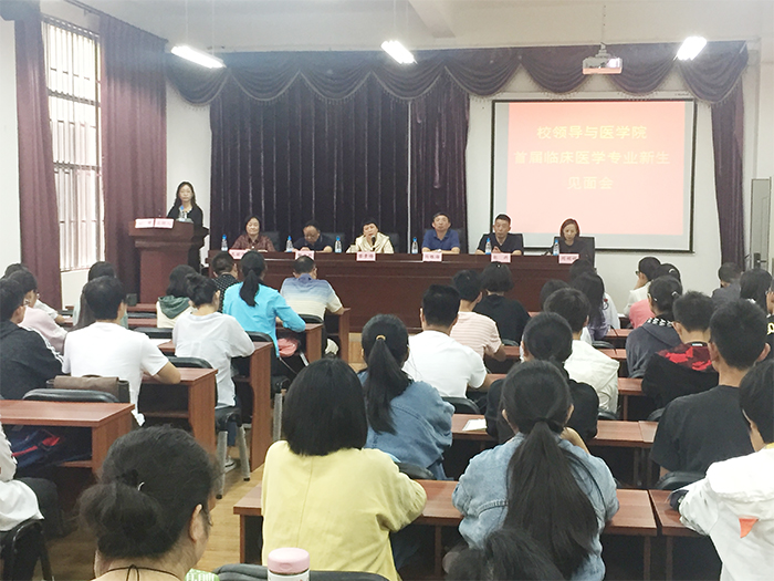9月4日,黎素梅校长,马银海副校长,教务处、学生处、招生就业处包兴处长、校办等部门负责人到医学院参加best365足球官网首届临床医学专业新生见面会。医学院班子成员、教研室主任、班主任、部分教师代表和临床医学专业全体44名新生参加了见面会。见面会由医学院院长余珊主持。