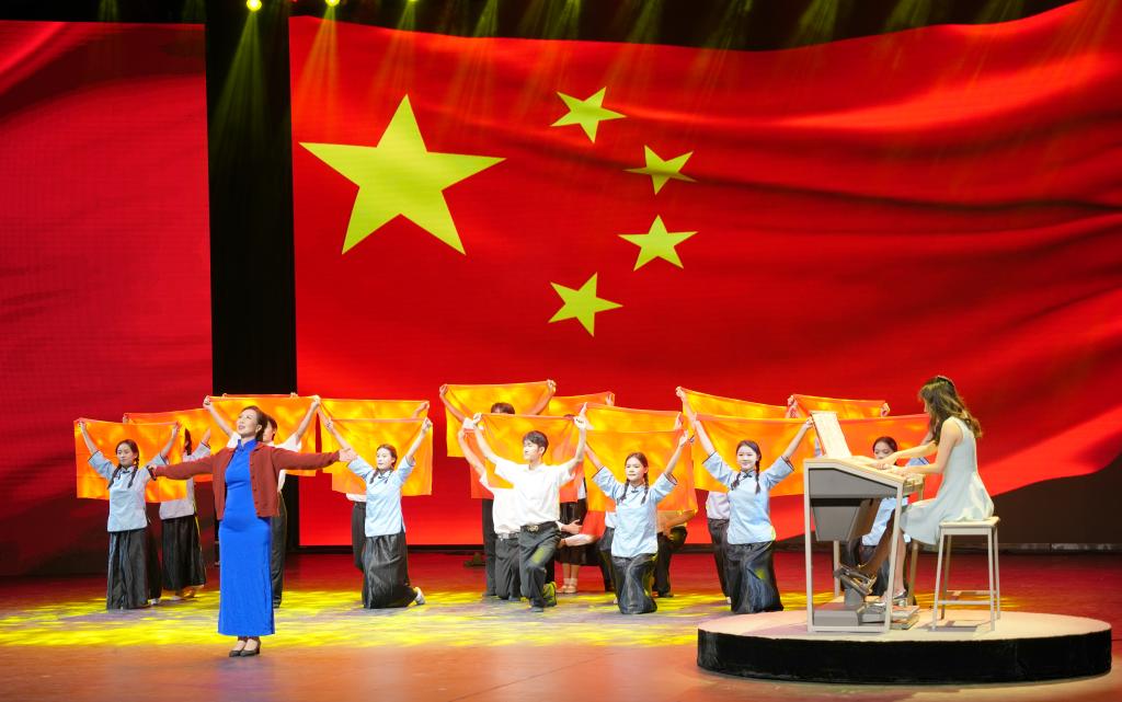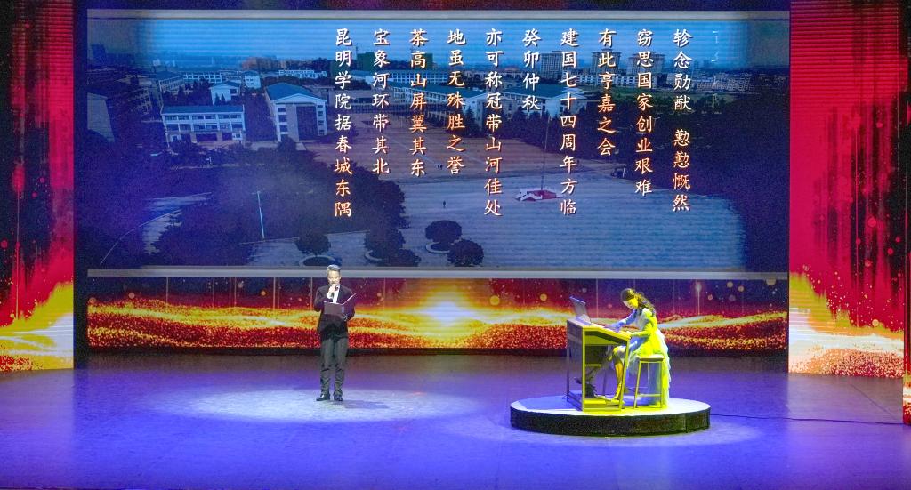 传承红色基因,赓续红色血脉。音乐舞蹈学院带来的音乐舞台剧《你一直在身边》,跨越时空与校友聂耳对话,为师生们讲述了聂耳和国歌的故事。人文学院师生的情景剧《昆明解放的第一抹红》,再现了昆明解放前夕,王运生老先生等革命先辈缝制并升起昆明第一批五星红旗的动人场景。