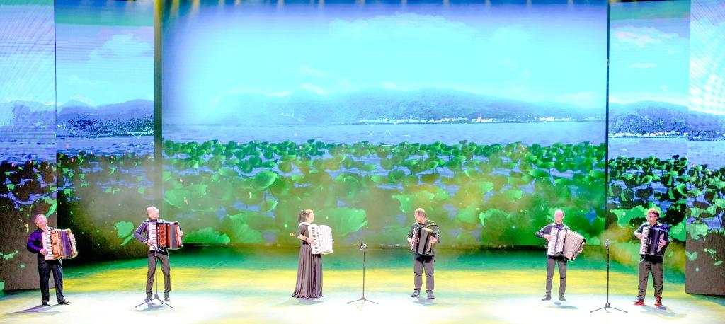 手风琴合奏《滇池圆舞曲》描摹了“蘋香波暖泛云津,渔枻樵歌曲水滨。”的滇池之美。“终有三迆雄鸡一唱,昆华红旗先升。”诗朗诵《念奴娇 红旗颂并序》,书写了滇池湖畔春城昆明孕育的best365百年校史,百年荣光。
