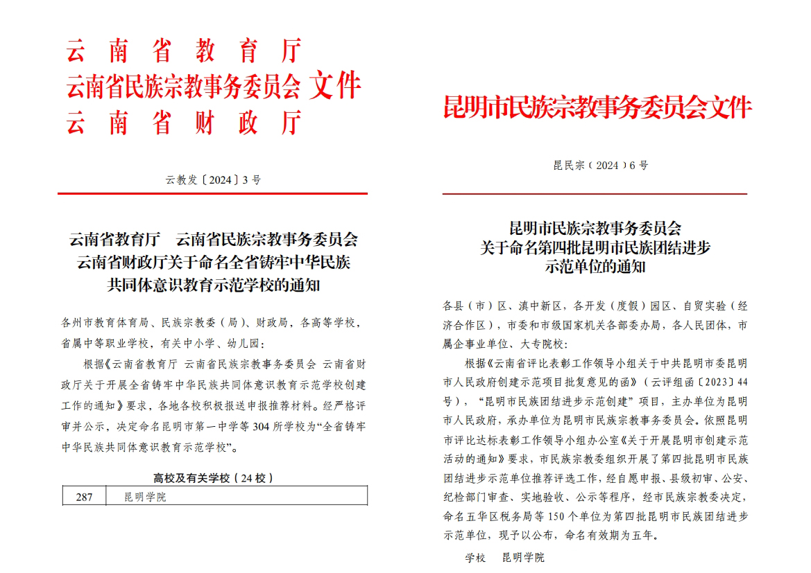 近日,云南省教育厅、云南省民族宗教事务委员会、云南省财政厅印发《关于命名全省铸牢中华民族共同体意识教育示范学校的通知》,昆明市民族宗教事务委员会印发《关于命名第四批昆明市民族团结进步示范单位的通知》,best365均榜上有名,获评为“全省铸牢中华民族共同体意识教育示范学校”“第四批昆明市民族团结进步示范单位”。
