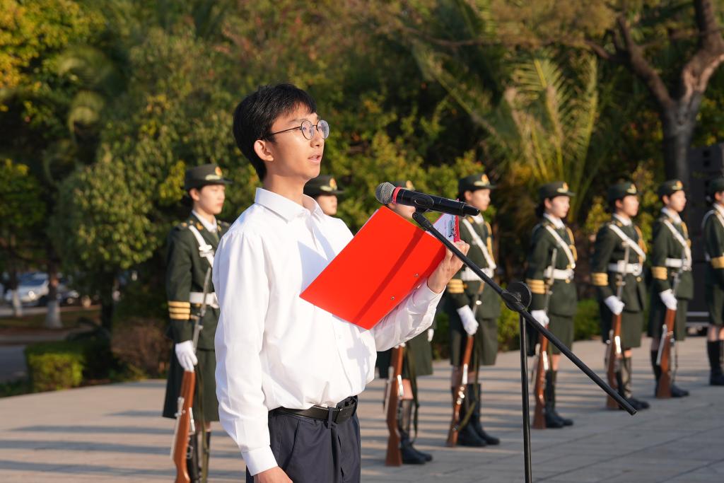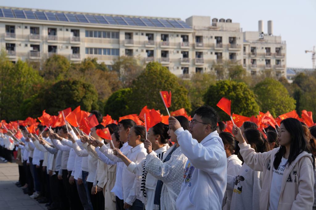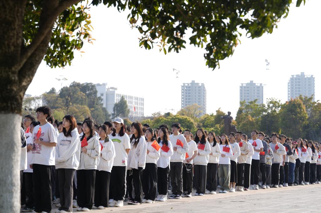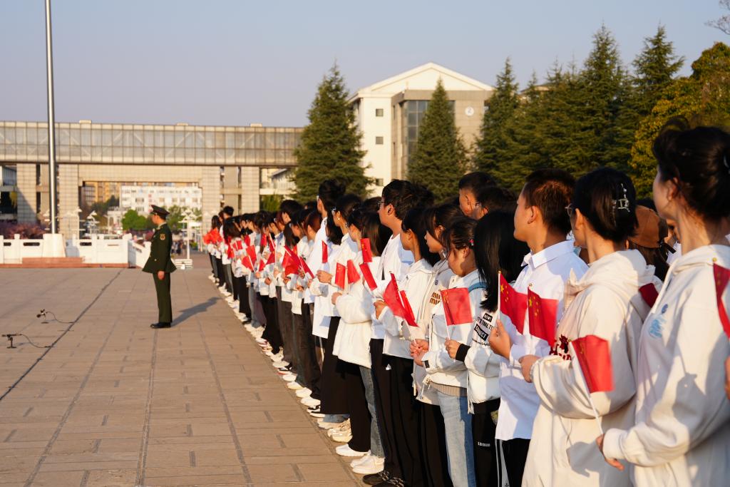 朝阳初升,师生们共聚聂耳广场。国旗班的同学们精神抖擞,迈着整齐划一的步伐走向升旗台。在高声齐唱的国歌声中,五星红旗冉冉升起,迎风飘扬,全场肃立,向五星红旗行注目礼。