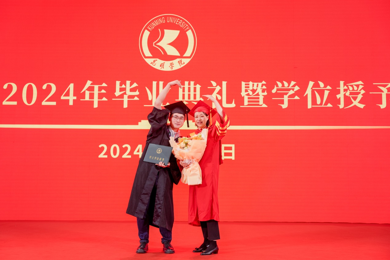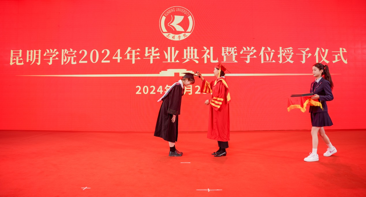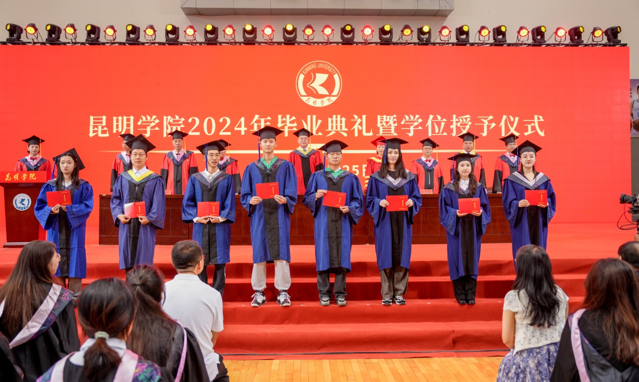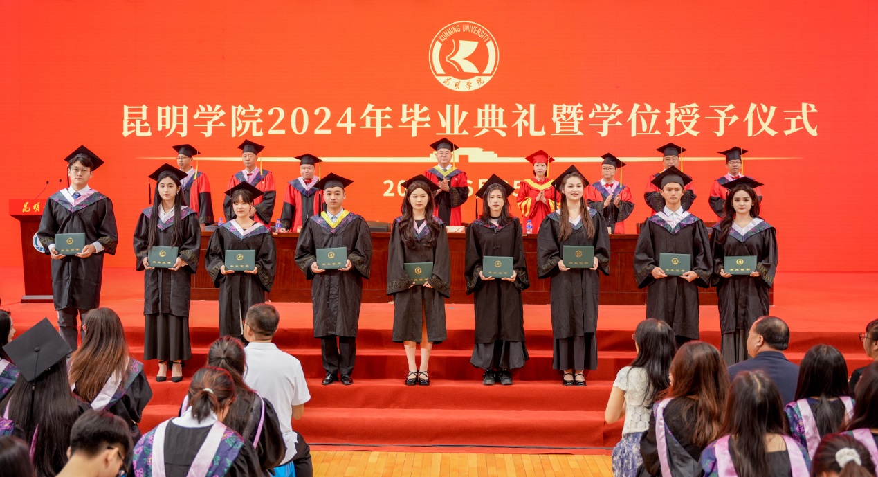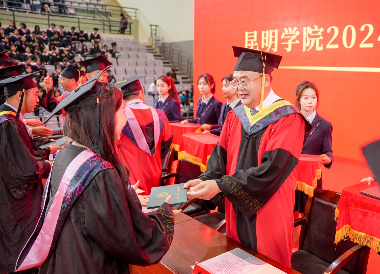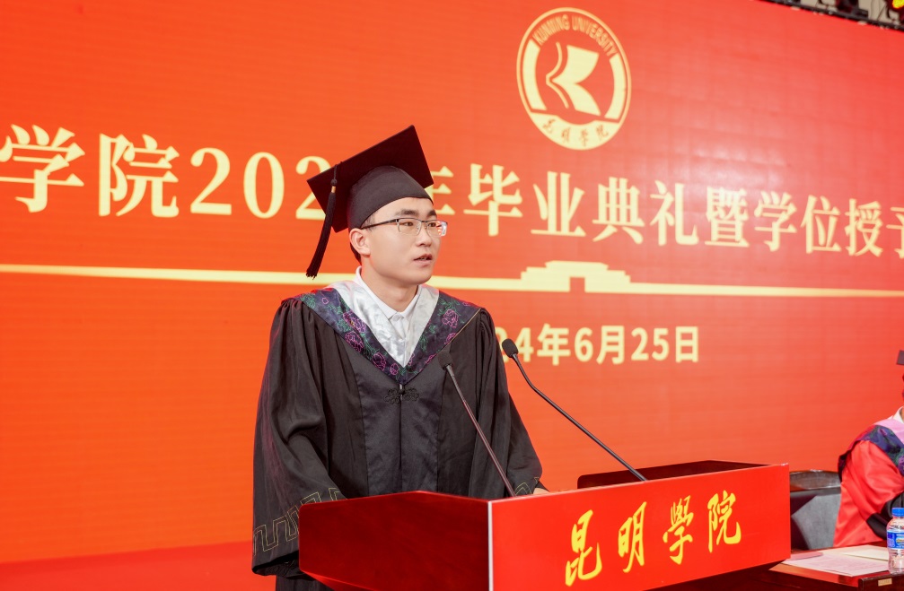 金幼和书记致辞,代表学校向2024届全体毕业生表示热烈祝贺,向一直以来辛勤耕耘、为同学们的成长成才付出心血汗水的老师们表示衷心的感谢。金幼和表示,四年前,同学们怀着梦想和激情从祖国四面八方来到best365足球官网,与祖国同频共振奔跑逐梦,共同见证了中国共产党百年华诞的光荣时刻,见证了第一个百年目标顺利实现,见证了党的二十大吹响奋进新征程的时代号角。一同亲历了脱贫攻坚千年梦圆、全面建成小康社会、全面开启中国式现代化新征程的重要历史时刻。大学四年,同学们与学校同心同行,我们共同迎接学校第二次党代会胜利召开,共绘学校“十四五”高质量发展的锦绣蓝图,共担“更名大学”的历史使命,共谱“教育高质量发展三年行动”新篇,共创第九届“互联网+”大学生创新创业大赛的优异成绩,同学们以青春之光为昆院添彩,昆院以高质量发展为同学们赋能,师生共赴“建设特色鲜明的综合性应用型高水平大学”新征程,收获了成长、责任和担当,也证明了自己有潜力担当大任、掌握未来。