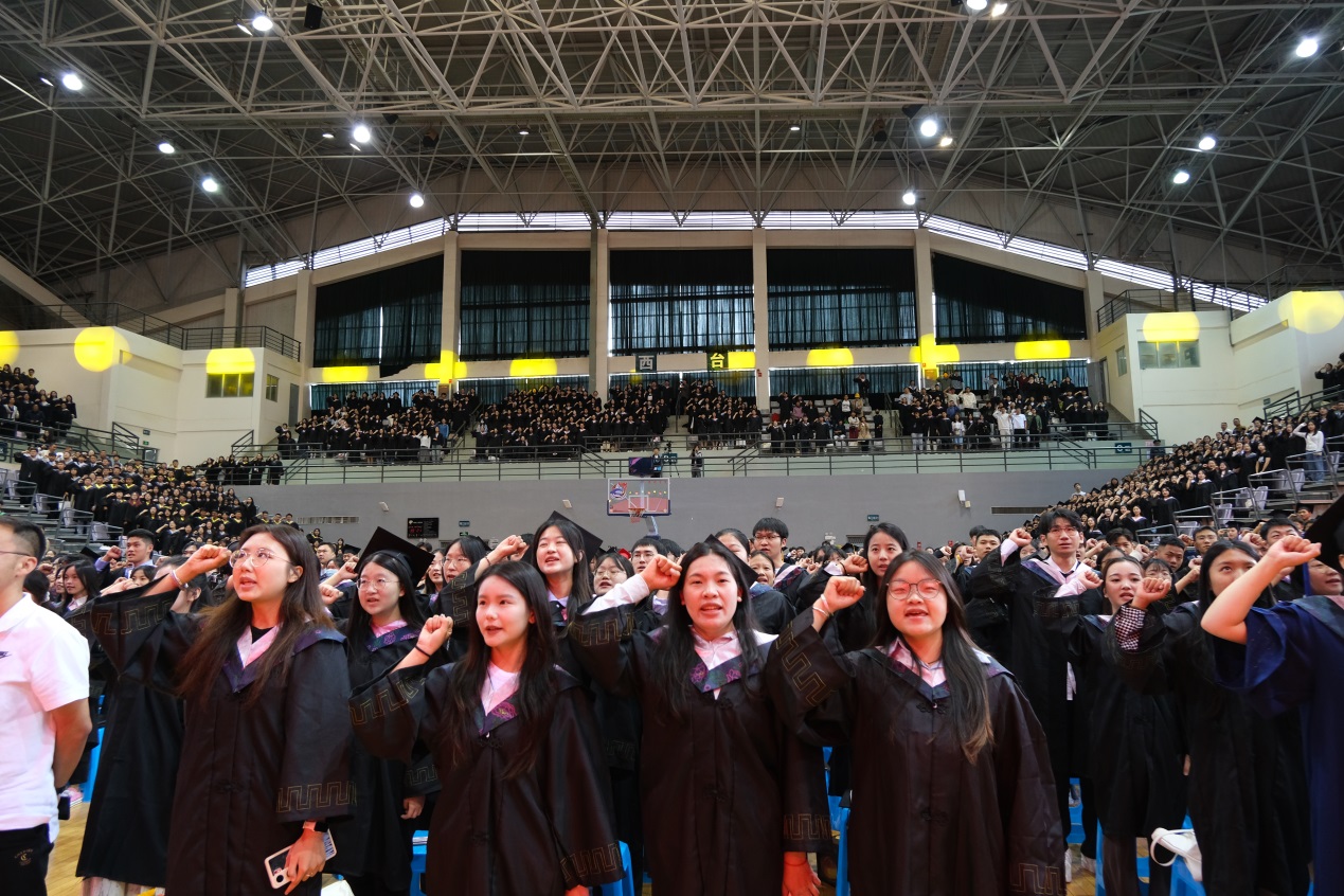 全体毕业生在领誓人的带领下庄严宣誓,用聪明和才智奉献社会,以青春和热血报效祖国。