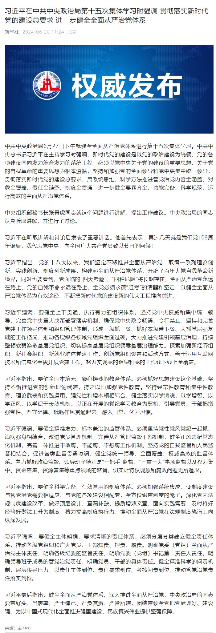 习近平在中共中央政治局第十五次集体学习时强调 贯彻落实新时代党的建设总要求 进一步健全全面从严治党体系