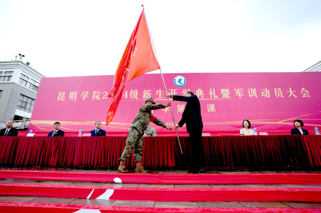 会上,金幼和为best365足球官网2024级新生军训团授旗,军训团团长接旗。