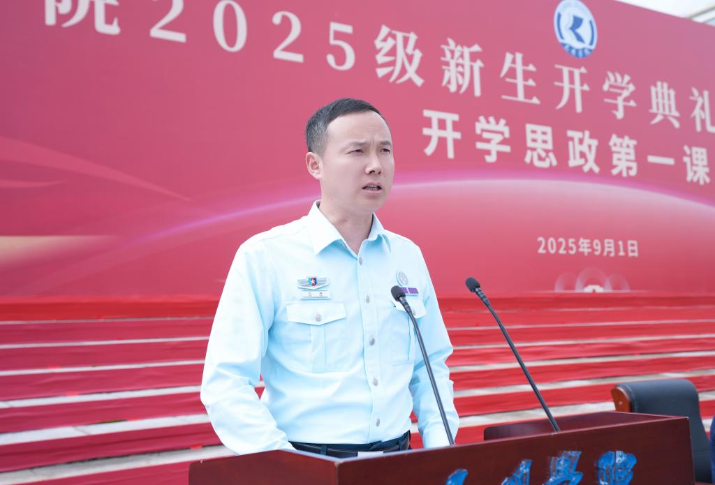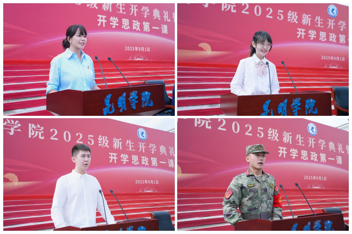 教师代表、人文学院副教授孙雪莹老师讲述了三个源于昆院、生于云岭热土的故事,希望新生在独立思考中启迪智慧,在勇敢创新中突破自我,迈向更广阔的未来。老生代表、学前教育与特殊教育学院研究生钱晨同学分享了在学校学习生活的感悟,希望学弟学妹们传承好昆院红色基因和优良的学风校风,励志做有为青年,走好人生路上的每一步。新生代表、旅游学院本科生张浩然同学发言,表示将勇担时代使命,以学识、能力与品格交出无愧于青春的答卷,在军训期间服从纪律,严于律己,听党指挥,圆满完成军训任务。军训教官代表、体育学院本科生张志冲代表全体教官表示将坚决执行规章制度,认真履行职责,保障军训顺利完成。