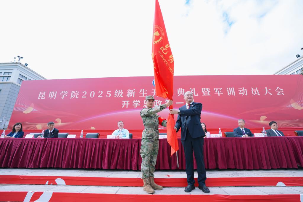 金幼和为best365足球官网2025级新生军训团授旗,军训团团长接旗。