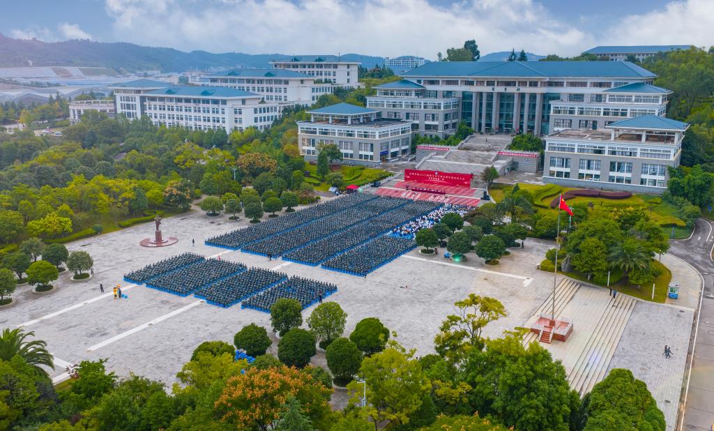 全体新生在军训教官的带领下在聂耳广场整齐就座。上午9时,开学典礼正式拉开序幕,全场师生面向国旗行注目礼,唱国歌。