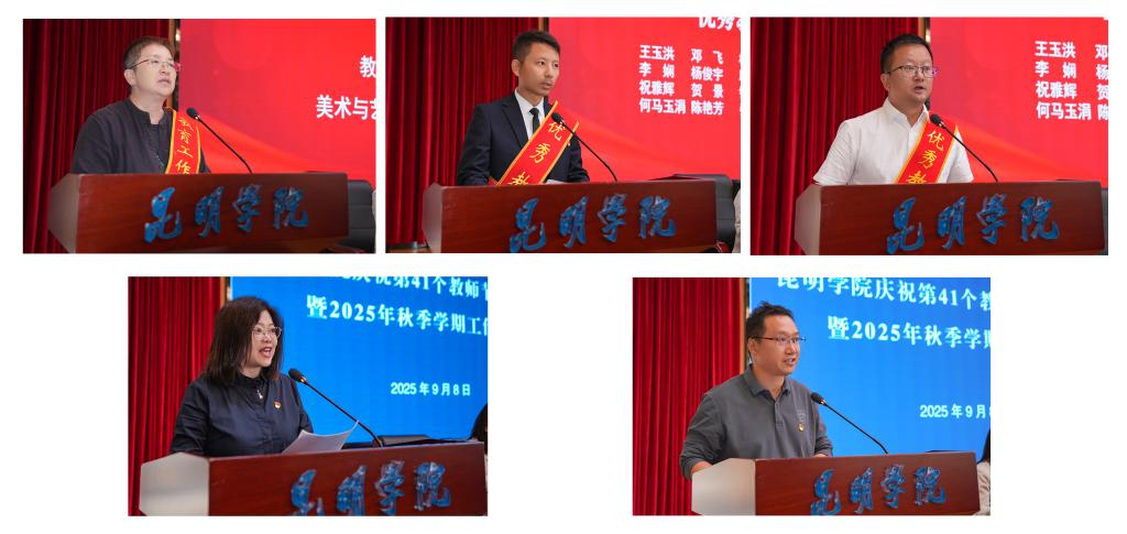 金幼和表示,近年来,学校党委高度重视教师队伍建设,坚持实施“人才强校”战略,落实师德师风第一标准要求,以教育家精神铸魂强师行动为引领,全面实施“立德”“引育”“培优”“团队”“改革”五大工程,教师队伍素质整体得到明显提升,涌现出云南省“兴滇英才支持计划”、昆明市“春城人才计划”等各级各类人才168人次,接连获评“全国模范教师”“云南省最美教师”“云南省优秀教师”“云南省最美高校辅导员”“云南省最美高校班主任”等8人,“云南省教育工作先进集体”“云南省高校黄大年式教师团队”等2个。今天表先进集体和先进个人是全校教师队伍的优秀代表,为我们树立了榜样,希望全校教职员工向先进典型学习,时时以习近平总书记提出的“四有好老师”“四个引路人”和“四个相统一”标准来严格审视自己,大力弘扬践行教育家精神,潜心治学、悉心育人,做让党放心、让人民满意的好老师。