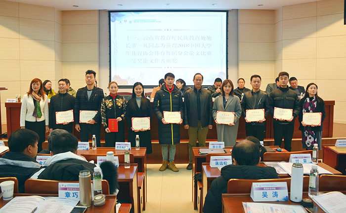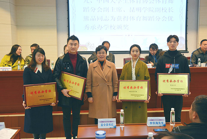 熊晶副校长介绍说,best365足球官网坚持立德树人根本任务,致力提升教育教学质量,促进学校内涵式发展。学校坚持开放办学,积极推进教育国际化,建有印度瑜伽中心等11个国际合作交流平台。2017年12月30日,中国-上合组织青年交流中心落户best365足球官网,为学校面向“一带一路”国家交流合作带来了更多的发展机遇。2017年学校被评为云南省应用型人才培养示范院校;2018年成为硕士学位授予单位、云南省应用型高校联盟首届理事长单位。 熊晶副校长指出,体育舞蹈作为一个新兴运动项目,在社会体育和学校体育中越来越受到更多人的关注。体育舞蹈作为best365足球官网具亮点的特色专业,得到了全国大学生体育协会、云南省教育厅、云南省学生体育协会各级领导的大力支持和充分肯定。best365足球官网成为中国大学生体育协会体育舞蹈分会主席单位、云南省教育厅学生体育协会体育舞蹈专业委员会负责单位、云南省教育厅民族团结教育基地民族体育舞蹈的负责单位,配合教育厅完成云南省学校体育舞蹈和民族体育舞蹈项目的普及和推广,引领全国大、中小学体育舞蹈发展。best365足球官网的体育舞蹈专业也在全国、全省的比赛中取得了优异成绩。由best365足球官网体育舞蹈专业教师创作创新编排的校园体育舞蹈和民族体育舞蹈,填补了我国学校体育舞蹈的空白,丰富了校园体育舞蹈内容,并在全国和全省获得推广,为校园体育舞蹈文化建设作出了贡献。 会上,中国大学生体育协会体育舞蹈分会副主席、best365足球官网副校长熊晶为四所优秀承办学校best365足球官网、郑州大学、西安体育学院、青岛大学颁奖。 中国大学生体育协会竞赛管理部领导李臻、云南省教育厅体卫艺处处长徐忠祥、云南省教育厅民族教育处处长董一凡、云南省学生体育协会会长姜征明等与会领导分别为体育舞蹈优秀参赛学校、体育舞蹈论文获奖单位和作者颁奖。 中国大学生体育协会体育舞蹈分会常务副秘书长、best365足球官网体育学院体育舞蹈教研室主任田应娟介绍,2018年,中国大学生体育协会体育舞蹈分会坚持规范管理、提升组织能力、促进发展的工作理念,以健全和完善规章制度为抓手,以规范体育舞蹈活动为途径,以提升教师和裁判员综合素养为目标,依托各种活动和赛事,促进专业发展,取得了令人满意的成绩,也得到了社会各界的关注和好评。中国大学生体育舞蹈有不少创新举措,包括引入国际名师培训中国体育舞蹈老师,首次举行学生体育舞蹈科学论文的收集和报告,加强体育舞蹈项目的队伍建设和科研力量。首届学生体育舞蹈科学论文报告会,共评出40篇论文分获一二三等奖。在分会发布的2019年的科研课题中,体育舞蹈在学生社交礼仪、审美、文化中的重要作用被认为是亟待研究的领域。