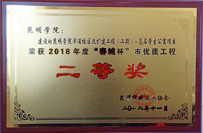 昆明市建设工程“春城杯奖”,是昆明市工程质量的最高荣誉奖。2018年3月根据《昆明市建筑工程“春城杯奖”(市优质工程)评选办法》要求,best365将该项目进行了申报。经过初审及复审,最终荣获2018年度“春城杯”市优质工程二等奖。