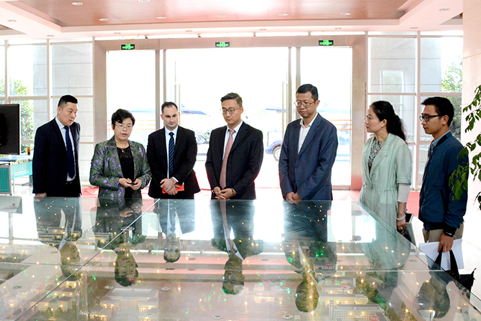 熊晶副校长在办公楼学校模型沙盘前向来宾介绍学校近年来的建设发展情况,并陪同来宾参观了青年中心、旅游学院烹饪实验室和酒水实验室。