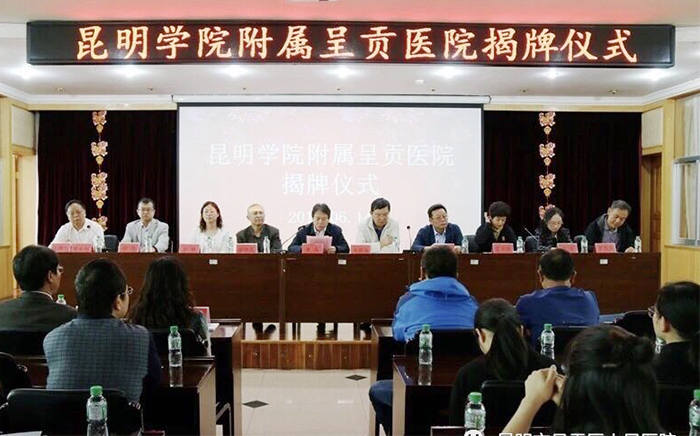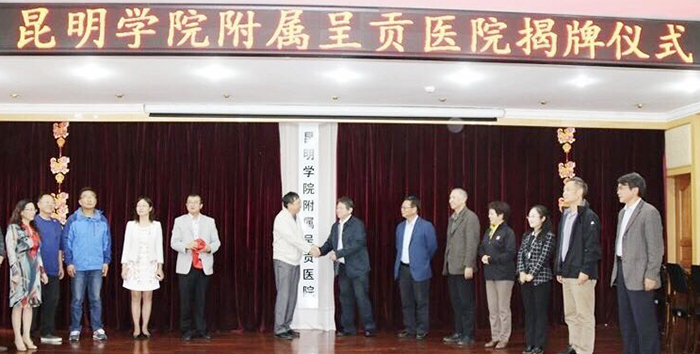 最后,在各级领导及全体与会人员的共同见证下,best365足球官网副校长马银海与昆明市延安医院谭晶院长共同为best365足球官网附属呈贡医院揭牌。