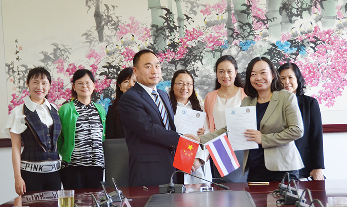 郭华副校长向泰国南佛统皇家大学副校长Suvimol Mukviboonchai女士一行介绍学校概况、办学条件、校际交流项目以及办学特色等情况。