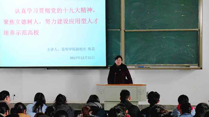 12月22日,校党委委员、副校长熊晶为美术与艺术设计学院、物理科学与技术系师生党员专题宣讲党的十九大精神。两个院系的党政领导、党员师生近200人共同聆听了辅导报告,美艺学院党总支书记罗进主持报告会。