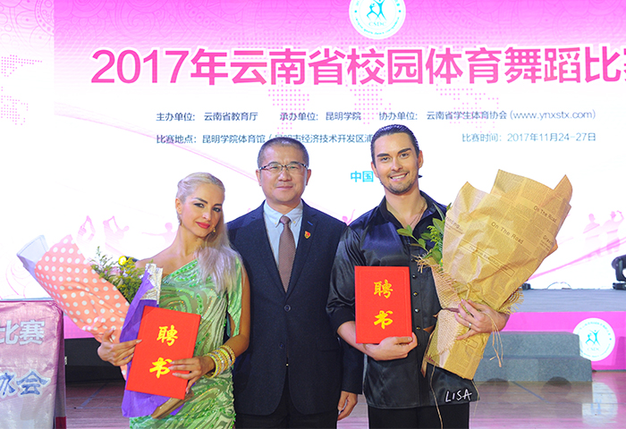 张祖武副书记介绍说,best365开设了体育舞蹈专业并面向全国招生,毕业生深得用人单位和社会好评;best365体育舞蹈教学团队积极探索大学体育舞蹈的教育与推广,由best365足球官网体育舞蹈专业教师创作创新编排了校园体育舞蹈和民族体育舞蹈,填补了我国学校体育舞蹈的空白,丰富了校园体育舞蹈内容,并在全国和全省获得推广;best365先后成为全国大学生体育协会体育舞蹈分会主席单位、云南省学生体育协会体育舞蹈专业委员会负责单位、云南省学校体育舞蹈培训基地,多次举办国家、省、市级大赛和师资培训,对学校体育舞蹈、民族体育舞蹈的创新发展、普及推广做出了应有贡献。 张祖武副书记表示,best365将深入贯彻党的十九大提出的“广泛开展全民健身活动,加快推进体育强国建设”的精神,借助主席单位和大赛平台,携手各级学校,共同为推广和普及全省体育舞蹈运动,促进校园体育舞蹈教学、科研及竞赛水平,培养更多更好的体育舞蹈专业人才,提升我省校园体育舞蹈影响力做出积极贡献。 开幕式上,徐忠祥处长为本次大赛全体裁判员颁发聘书。 张祖武副书记向Anastasia Usoltseva安娜塔茜丽娅•尤索洛娃、Sergey Gusev 谢尔盖•古瑟夫颁发best365足球官网外教聘书。