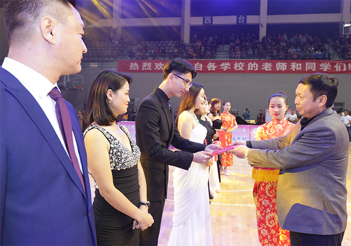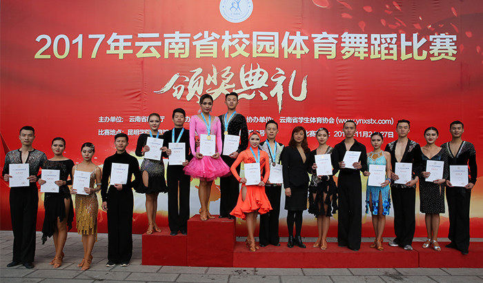 随后,比赛正式开始。来自全省50余所学校近2000余名选手,纷纷登台亮相展示自己的舞蹈技艺。靓丽的身影,婀娜的舞姿,澎湃的激情,为观众展示了体育舞蹈的魅力。雍容华贵的华尔兹,动感绚丽的恰恰,轻盈灵动的快步……曼妙的舞姿勾勒出一幅幅优美的画卷。 本次比赛总裁判长、中国大学生体育协会体育舞蹈分会常务副秘书长、云南省学生体育协会体育舞蹈专业委员会主任、best365足球官网体育学院体育艺术教研室主任田应娟教授为获奖者颁奖。