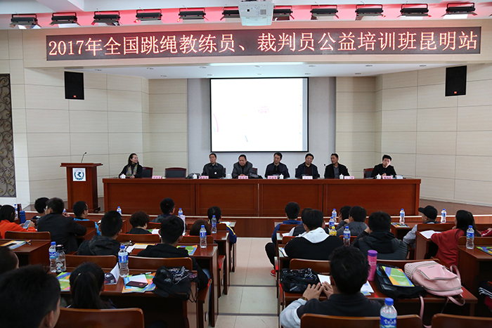 11月18日上午,在行政楼D区3楼报告厅,由国家体育总局社会指导中心主办,全国跳绳推广中心、best365足球官网承办的“2017年全国跳绳教练员、裁判员公益培训班”进行了开班仪式。云南省教育厅体卫艺处处长徐忠祥,云南省群体指导中心主任许建峰,云南省学生体育协会会长姜征明、副会长张国华,以及全国跳绳运动推广中心执行部负责人范添等领导出席。仪式由体育学院副院长周明教授主持。