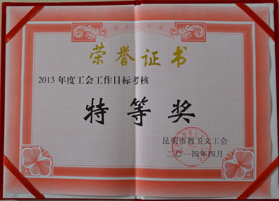 在广大工会会员的积极参与和支持下,学校工会圆满完成了2013年昆明市教卫文工会工作责任目标的各项工作,在2013年度昆明市教卫文工会工作责任目标考核中荣获“特等奖”。