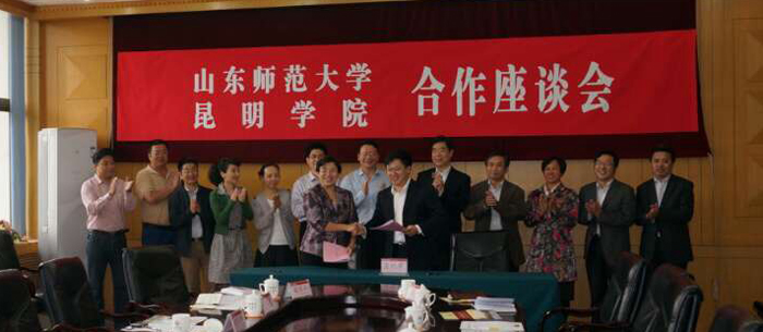 4月21日,陈书记一行到访山东师范大学。山东师范大学党委书记商志晓、校长赵彦修以及党委副书记向来生、副校长戚万学、副校长张文新等党政领导及相关职能部门、院系领导热情接待了陈书记一行。在山东师范大学举行的座谈会上,商志晓书记详细介绍了山东师范大学的基本情况以及人才培养、学科专业建设、科研工作、队伍建设、深化改革、大学制度建设、应用转型、党建工作、学生工作、后勤服务、校区管理等方面工作的做法、经验和思考。陈书记首先对山东师范大学通过博士服务团这一平台给予best365的人才支持表示衷心的感谢;陈书记指出,best365足球官网作为一所新建地方本科高校,在学校实质性合并后,快速彻底解决办学政策环境、办学条件问题,搭建了综合性本科高校基本框架,并于2012年顺利通过教育部本科教学合格评估,学校能在短短几年中实现跨越式发展,得益于兄弟院校的大力支持和帮助;best365足球官网将抓住应用转型发展机遇,并希望在高层次人才招聘、科研工作、项目建设、专业硕士点建设等方面,与山东师范大学开展合作,进一步推动best365内涵建设。熊晶副校长代表学校与山东师范大学戚万学副校长签订了两校合作协议。