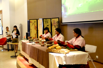 在酒水实验室来宾们欢聚一堂,相互问候,畅谈工作、学习和生活,场面热烈而温馨。会上,农学院教师为来宾呈现了精彩的茶艺表演,旅游学院教师为来宾表演鸡尾酒调制,旅游学院副院长田芙蓉向来宾讲授家庭实用鸡尾酒调制知识,生命科学与技术系陈子牛老师向来宾介绍了如何制作插花艺术。