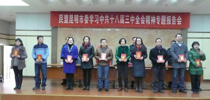 12月20日,民盟昆明市委在五华区政府四楼多功能厅召开中共十八届三中全会精神专题报告会,民盟best365足球官网总支10名盟员代表聆听了中共昆明市委宣讲团成员、市委政策研究室龚志龙主任对十八届三中全会精神的解读。