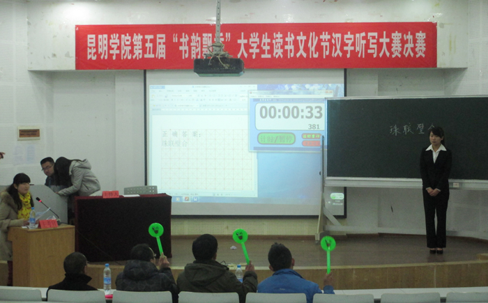 11月29日下午,由校学生会主办的第五届“书韵飘香”大学生读书文化节汉字听写大赛决赛在青年中心111报告厅举行。校团委副书记樊传章老师、校团委组织部副部长赵晋、大学生艺术团团长刘大鹏担任评委,校团委副书记、校学生会指导老师魏妮娅担任主考官。