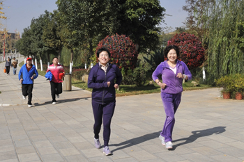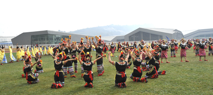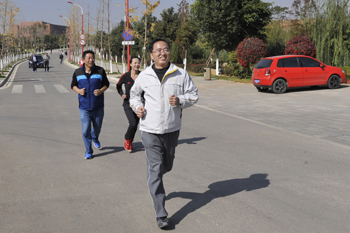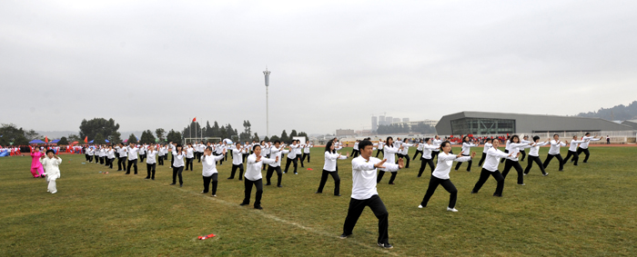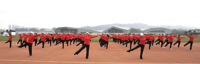 教职工代表队进行了广播操和太极拳表演。旅游学院、音乐学院、化学科学与技术系和生命科学与技术系以及医学院的同学们表演了团体操。