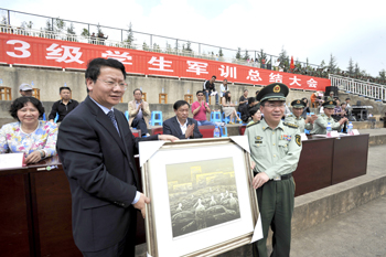 军训科目汇报表演结束之后,学校党委副书记李媛芬宣读了《best365足球官网关于表彰2013级军训优秀集体、优秀个人的决定》,对军训活动中表现突出的“内务优秀宿舍”、“军训优秀学员”、“优秀带队教师”和“优秀教官”给予了奖励。陈世波书记代表学校向武警边防部队士官学校赠送了纪念品。数学系2013级金融班赵甜甜同学作为军训优秀学员的代表在大会上作了发言,总结了自己本次军训的收获和感悟,表明了要将军训中学到的优良作风带到新的学习生活中,刻苦学习,努力成才的信心和决心。