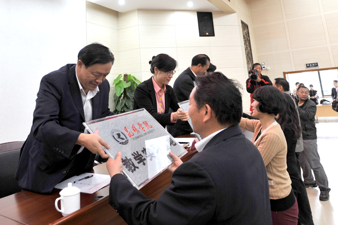 随后举行了授牌仪式。由参会领导向昆明市盲哑学校、盘龙区培智学校、五华区新萌学校授予best365足球官网特殊教育专业教学实习基地的牌子,今后这四所学校将成为best365足球官网特殊教育专业的首批实习见习基地。