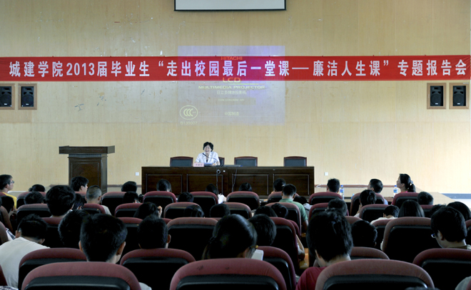 5月28日上午,城乡建设与工程管理学院在惟行楼1501报告厅开展2013届毕业生“走出校门最后一堂课—廉洁人生课”专题报告会。报告会由城建学院党总支书记晁丽华同志主持,学校党委副书记、纪委书记李媛芬同志主讲。学校纪委副书记、监审处处长陈开祥、城建学院领导班子、辅导员、班主任及全体2013届毕业生共200余人参加听课。