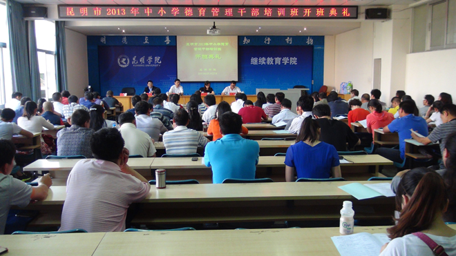 为全面贯彻落实中共中央国务院《关于进一步加强和改进未成年人思想道德建设的若干意见》和《昆明市中小学幼儿园“园丁工程”实施意见》,促进学校德育管理干部队伍建设,昆明市2013年德育管理干部培训班于5月27日至5月31日在best365继续教育学院举行,来自全市中小学的110名德育管理干部参加为期一周的集中培训。昆明市教育局副局长李瑞林、师训处处长王建方,best365继续教育学院院长陈嘉、副院长张培宏出席了开班典礼。