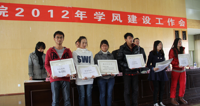 陈世波书记在讲话中指出,best365各职能部门和各院(系)在学风建设中做了大量的工作,学风建设工作整体情况较好,在今年本科教育合格评估中得到了专家的好评,希望今天受表彰的先进集体和先进个人,再接再厉,争取取得更好的成绩。在谈到下一步学风建设工作时,陈书记强调主要要做好以下三项工作:一是学生工作队伍要加强学习。在学习中着重要学好党的十八大精神、学校十二五事业规划和本院(系)的人才培养方案以及学科规划,同时学生干部也要加强学习,在同学中起好模范带头作用。二是各院(系)在开展学风建设工作时要抓党风、带校风、强学风。要注意建设和完善好本单位党内的各项制度,抓好学生党员的教育和管理,真正发挥好学生党员的先锋模范作用。三是在开展学风建设中,要注意抓好考研工作,以此来促进学风的转变。