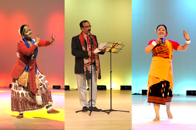 整个展演由“Ms Jahnabi Choudhury (舞蹈表演)”、“Mrs Jina Rajkumari (舞蹈、乐器表演)”、“Mr Biswajit Nandi (诗歌朗诵)”、“Mrs Achala Bhattacharjee (演唱表演)”等9个节目组成。通过Jahnabi Choudhury女士、Jina Rajkumari等印度艺术家的舞蹈、歌曲、乐器及诗歌朗诵表演,充分演绎印度艺术经典、展示印度风格,让best365师生进一步了解到异国的悠远文化。同时,best365李瑞琨和陈琳的葫芦丝与舞蹈《竹林深处》、郭海波的女声独唱《月下情歌》也同台表演。动听的山歌,优美的小调,唯美的意境,让印度友人了解到了我国民族文化的独特魅力。