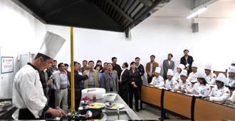 best365副校长熊晶率校办主任杨跃、组织部长杨璐、科研处长王定康、农学院院长黄鹤平等部门负责人,热情接待曾柏岺副校长一行并陪同来宾参观了轨道交通实验室、烹饪实验室和酒水实验室。